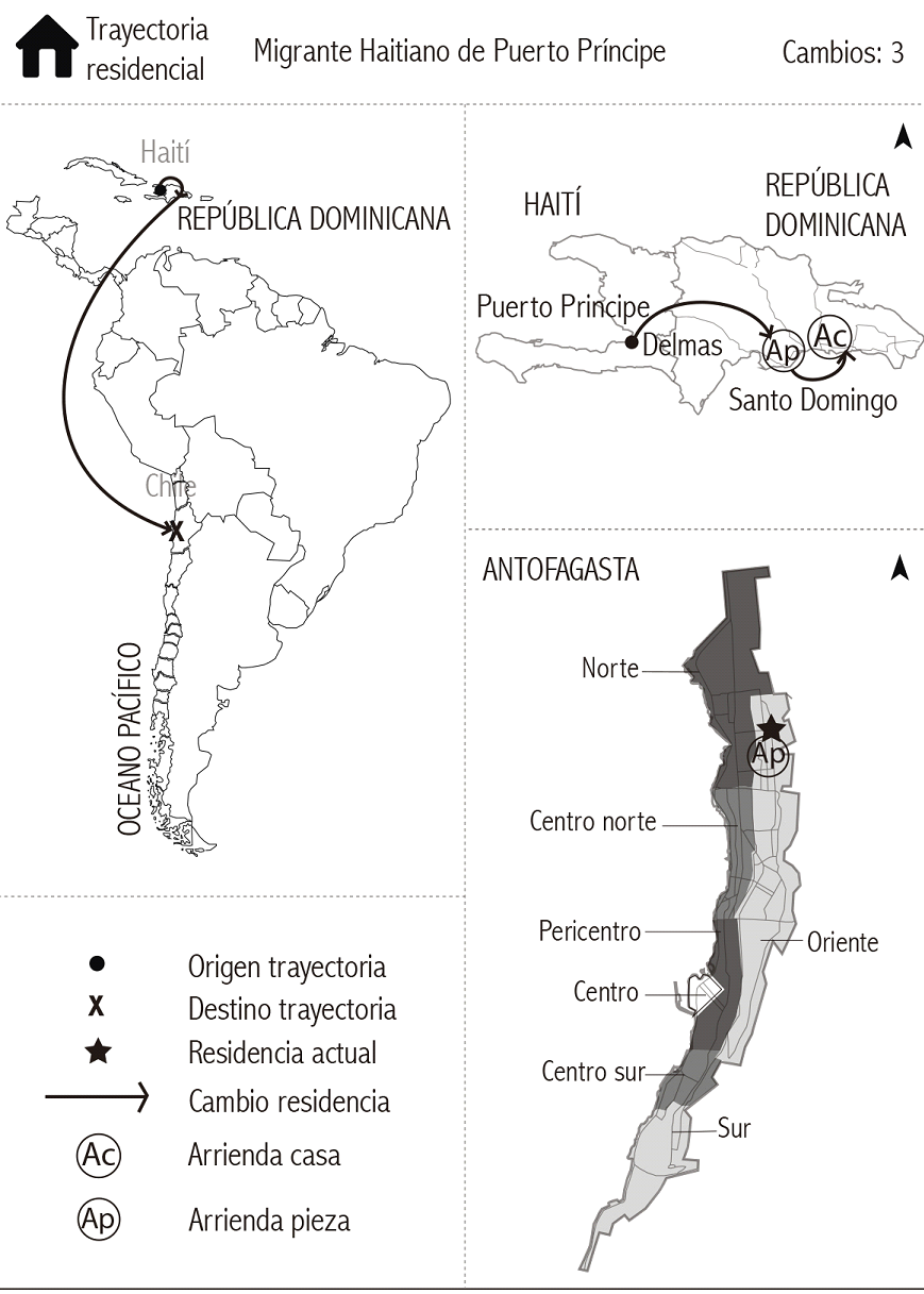 La Figura 2 muestra la trayectoria de un hombre haitiano que cruzó hacia Santo Domingo, República Dominicana. Un hombre que estudió, se educó, pero que fue racializado y discriminado en el país vecino, el territorio más próximo. Diferentes causas explican su llegada a Chile y Antofagasta. En todos sus cambios después de salir de Haití vivió en pieza arrendada y al igual que muchos de sus compatriotas es maltratado por no querer vivir hacinado en la ciudad de Antofagasta, una rica ciudad minera, pero que agudiza la desigualdad hacia el oriente y en algunas partes del centro. Por tanto, Parinacota(s) hay en todas partes de este país.