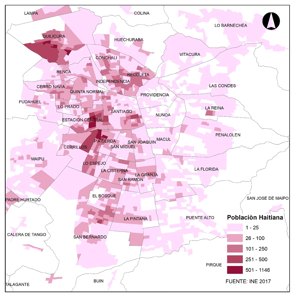En nuestro país, habitan aproximadamente 65 mil personas de origen haitiano, quienes se asientan mayoritariamente en la ciudad de Santiago (Mapa 1), y más específicamente, en las comunas de Quilicura, Estación Central, Santiago, San Bernardo o Pedro Aguirre Cerda. En algunas de estas comunas se han desarrollado programas para migrantes, buscando orientarlos y apoyarlos. Sin embargo, los recursos y las capacidades de los gobiernos locales son escasos cuando no tenemos política migratoria, o bien, cuando se diseña una que no contempla el acceso a la vivienda como un derecho humano básico.