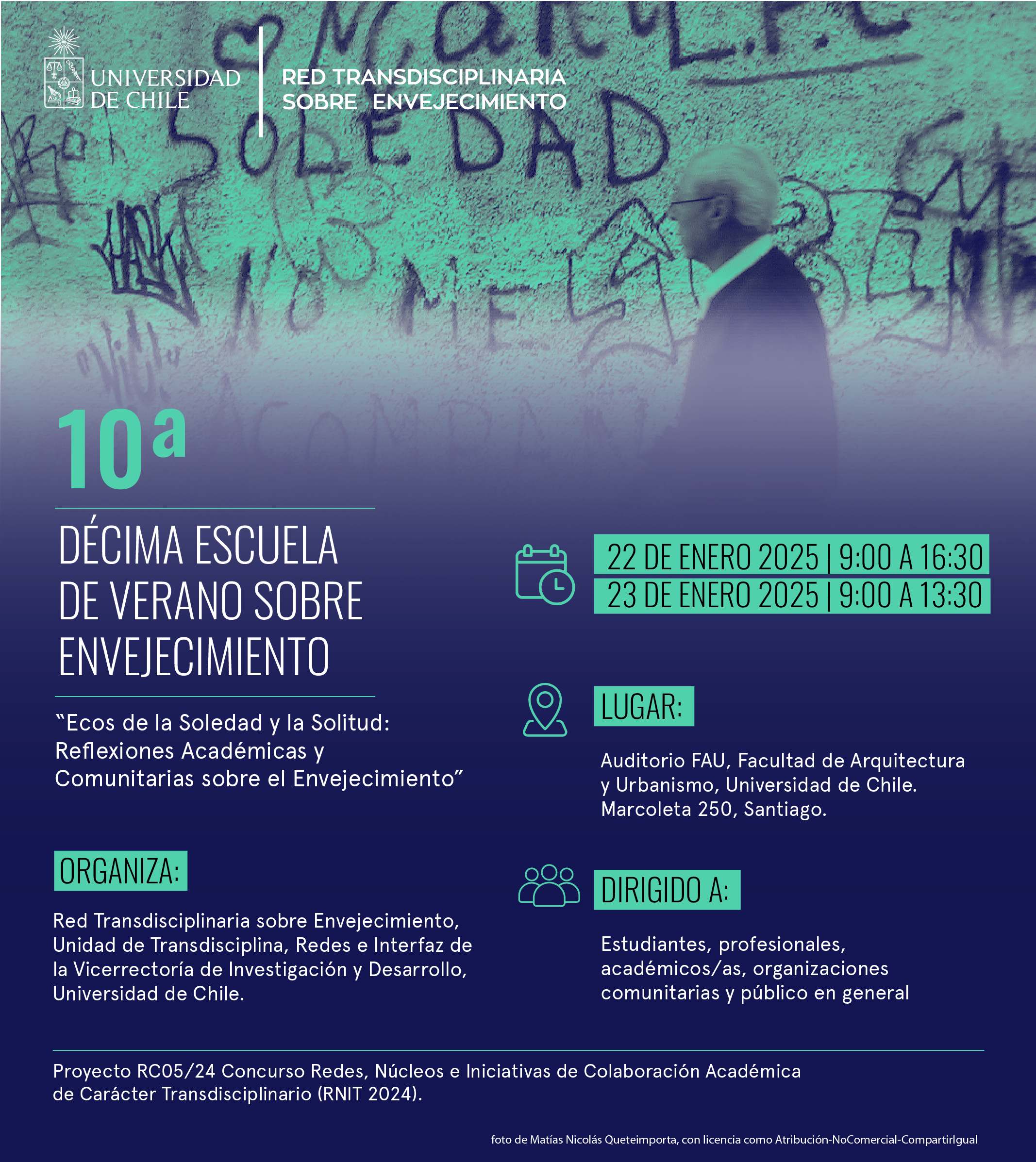 La Red Transdisciplinaria sobre Envejecimiento y la Unidad de Transdisciplina, Redes e Interfaz de la Vicerrectoría de Investigación de la Universidad de Chile, en su compromiso con una reflexión experta y de múltiples miradas, invita a una nueva versión de su Escuela de Verano. En esta décima versión, orientaremos nuestra reflexión hacia el fenómeno emergente de la soledad y el aislamiento social con una mirada transdisciplinaria, que permita abordarla desde la participación social y el fomento de la conexión social; y donde confluirán las voces expertas de académicos, de investigadores jóvenes, de profesionales y de comunidades de personas mayores, que posibiliten abordar el desafío común de generar propuestas que mejoren la calidad de vida de nuestras personas mayores.