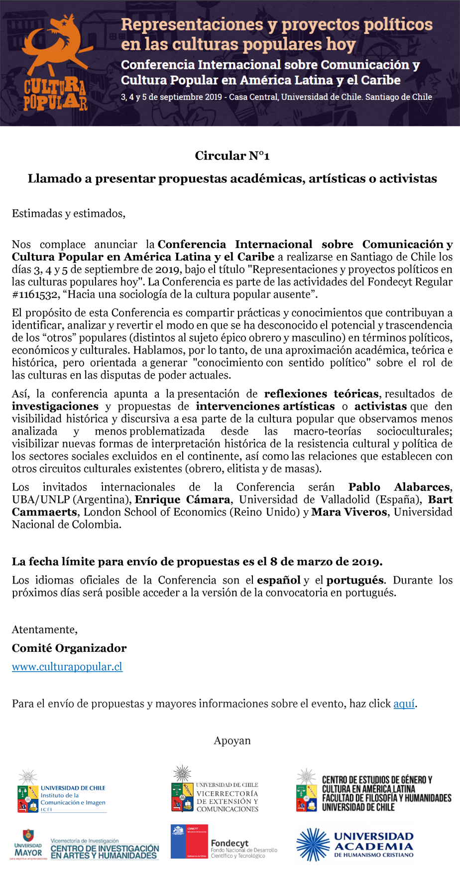 Más información en el siguiente enlace http://www.culturapopular.cl/conferencia-internacional-comunicacion-cultura-popular/