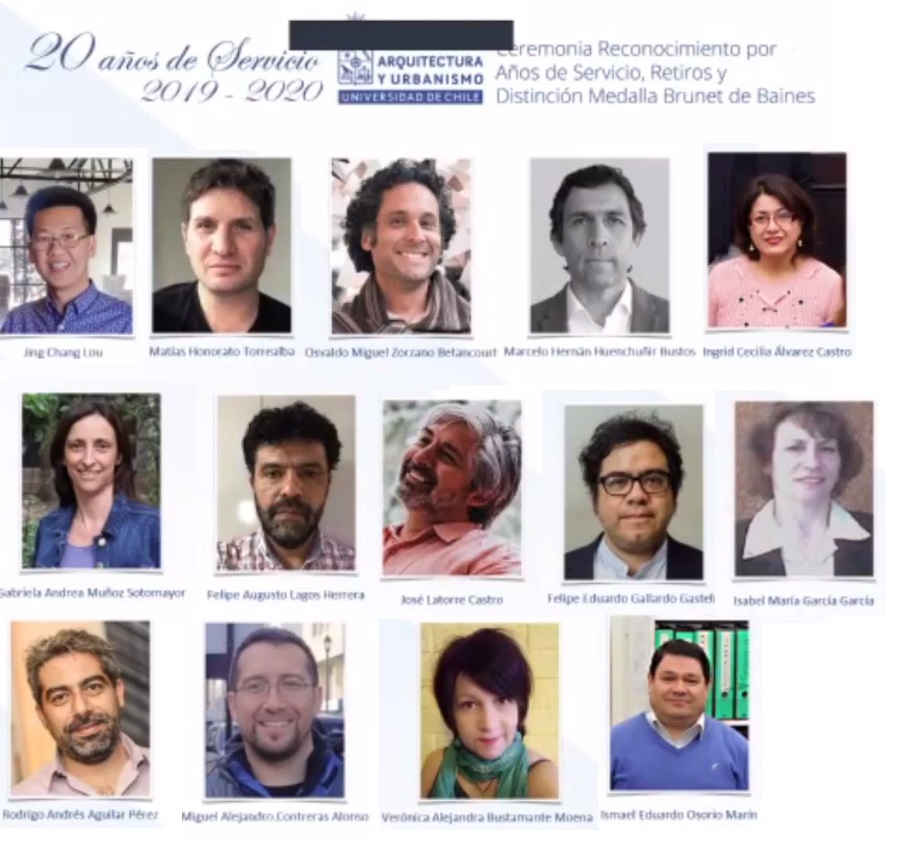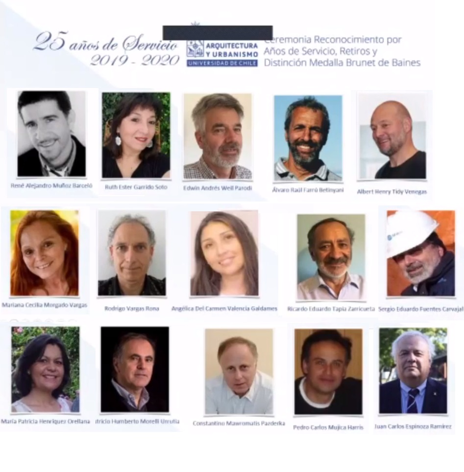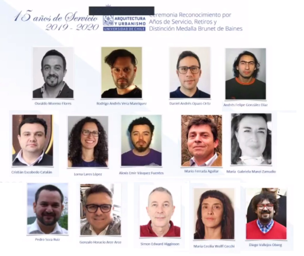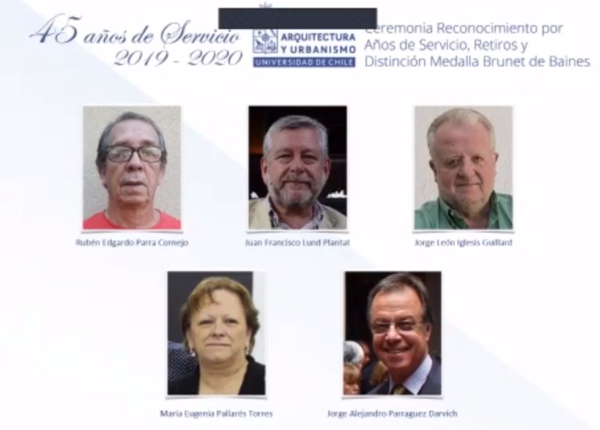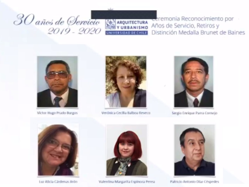 Por sus tres décadas de trabajo en la Fau, se reconoció a Víctor Hugo Prado Burgos, Verónica Cecilia Balboa Reveco, Sergio Enrique Parra Cornejo, Luz Alicia Cárdenas Jirón, Valentina Margarita Espinoza Perea y Patricio Antonio Díaz Céspedes.
