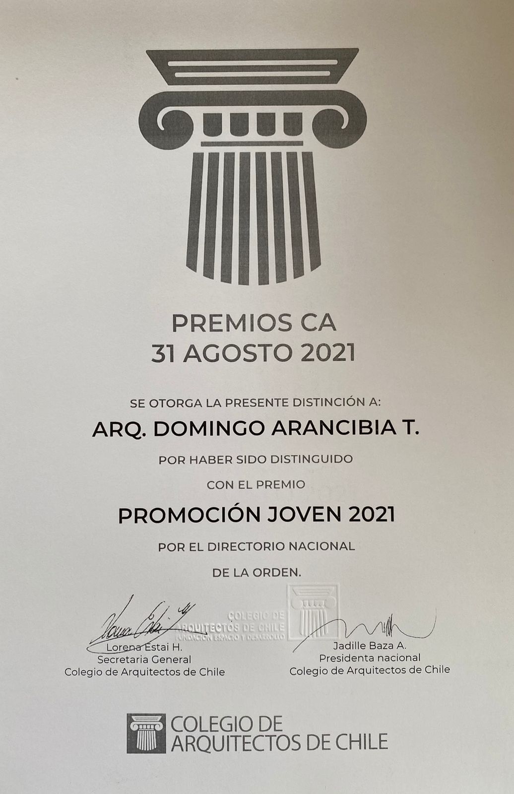 "Veo en este premio la posibilidad de reconocer a todas las personas que han sido parte de mi proceso y que me han apoyado. Yo entiendo la arquitectura como un trabajo colaborativo y colectivo, por tanto este premio amerita reconocer a todas y todos quienes me han ayudado en mi crecimiento como persona y como profesional", sostuvo Domingo Arancibia tras recibir una de las categorías con mayor proyección entre arquitectas y arquitectos.
