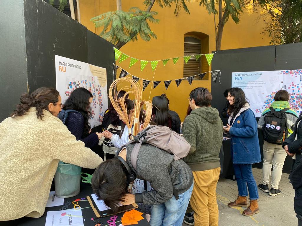 El evento Feria Comunidad Saludable contó también con un Mapeo Participativo, una actividad dinámica y lúdica que invitó a las y los estudiantes a reflexionar y jugar disponiendo stickers de emociones y significados a los distintos espacios de encuentro de FAU.