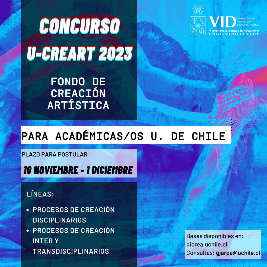 El concurso U-Creart 2023: Fondo de Creación Artística, busca fomentar y difundir la creación artística a nivel de procesos de creación y/o resultados de obra, encabezada por académicos y académicas de la Universidad de Chile, junto a otros actores involucrados como estudiantes, instituciones académicas aliadas y sociedad civil.
