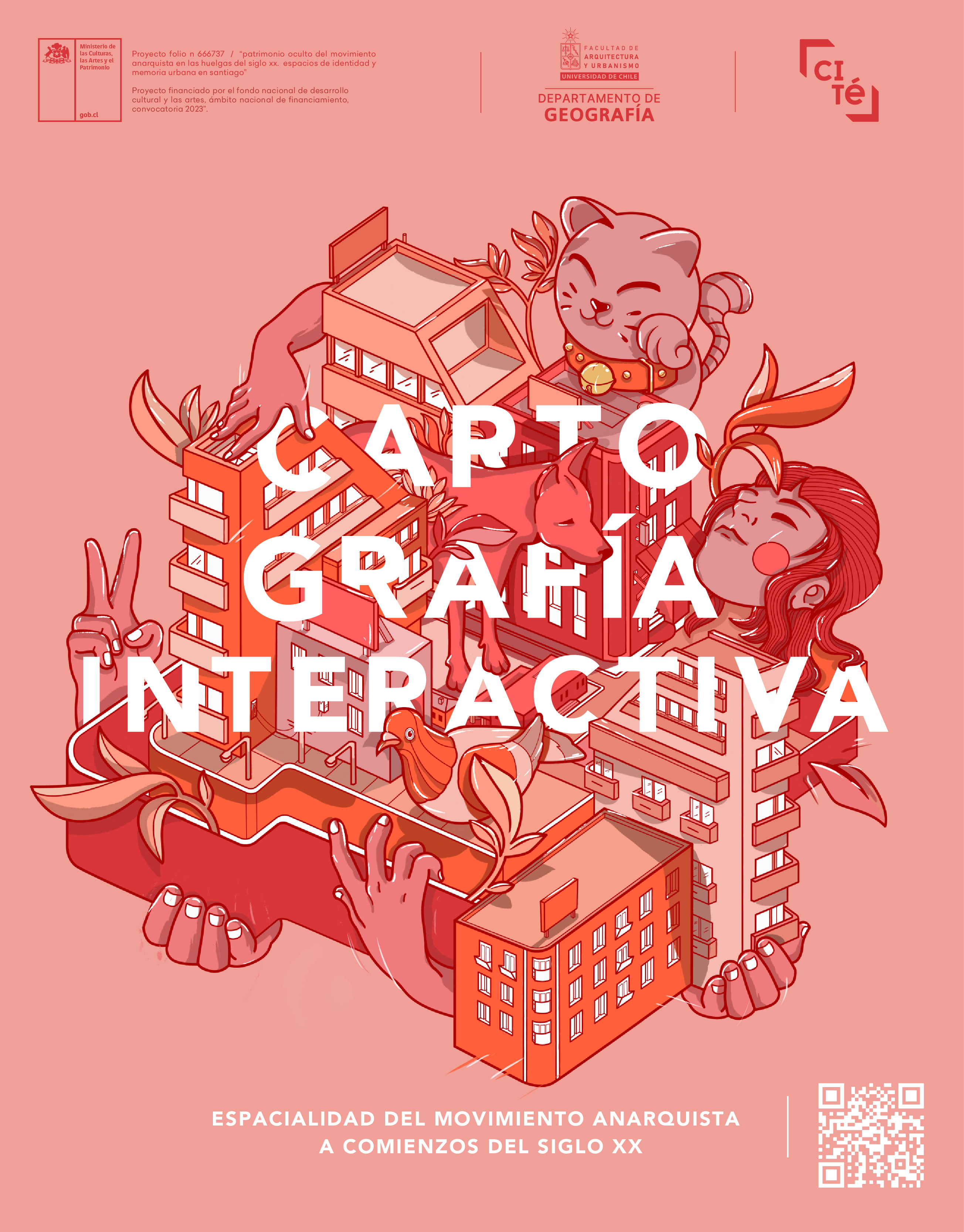 La cartografía interactiva “Espacialidad del Movimiento Anarquista de comienzos del siglo XX” se realizó en el marco del Fondart Nacional Folio Nº666737 “Patrimonio Oculto del Movimiento Anarquista en las Huelgas del Siglo XX. Espacios de Identidad y Memoria Urbana en Santiago. Financiado por el Ministerio de las Culturas, las Artes y el Patrimonio.