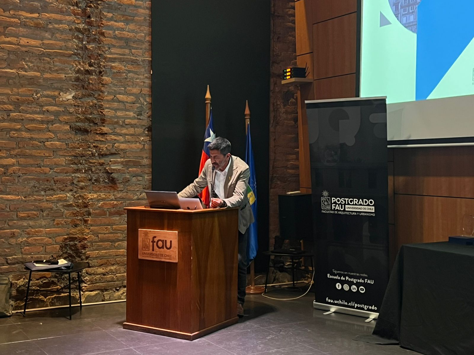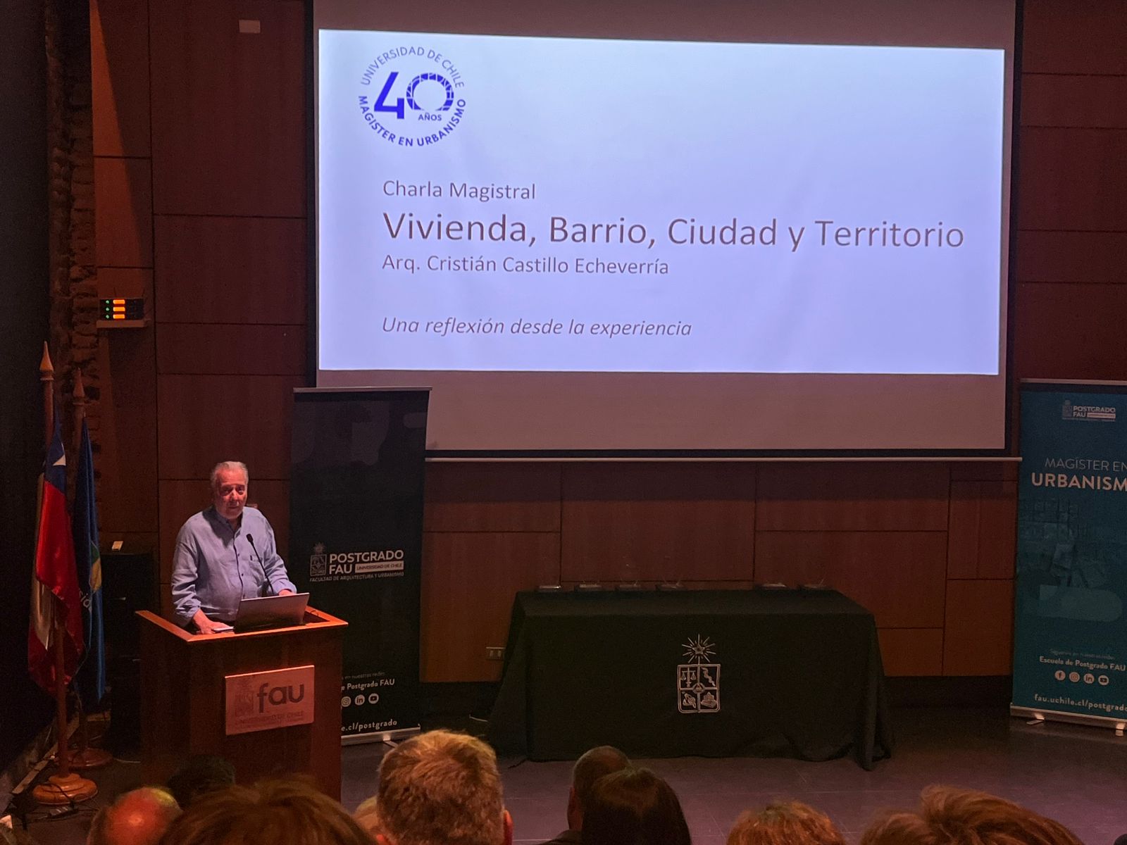 Tras los saludos protocolares, la comunidad académica dio paso a la exposición de Cristián Castillo. El arquitecto ha sido galardonado con el Premio Aporte Urbano 2022 en la categoría Integración Social y con el Premio Nacional de Arquitectura 2024, distinciones que remarcan su aporte al desarrollo urbano, la vivienda social y la integración comunitaria.