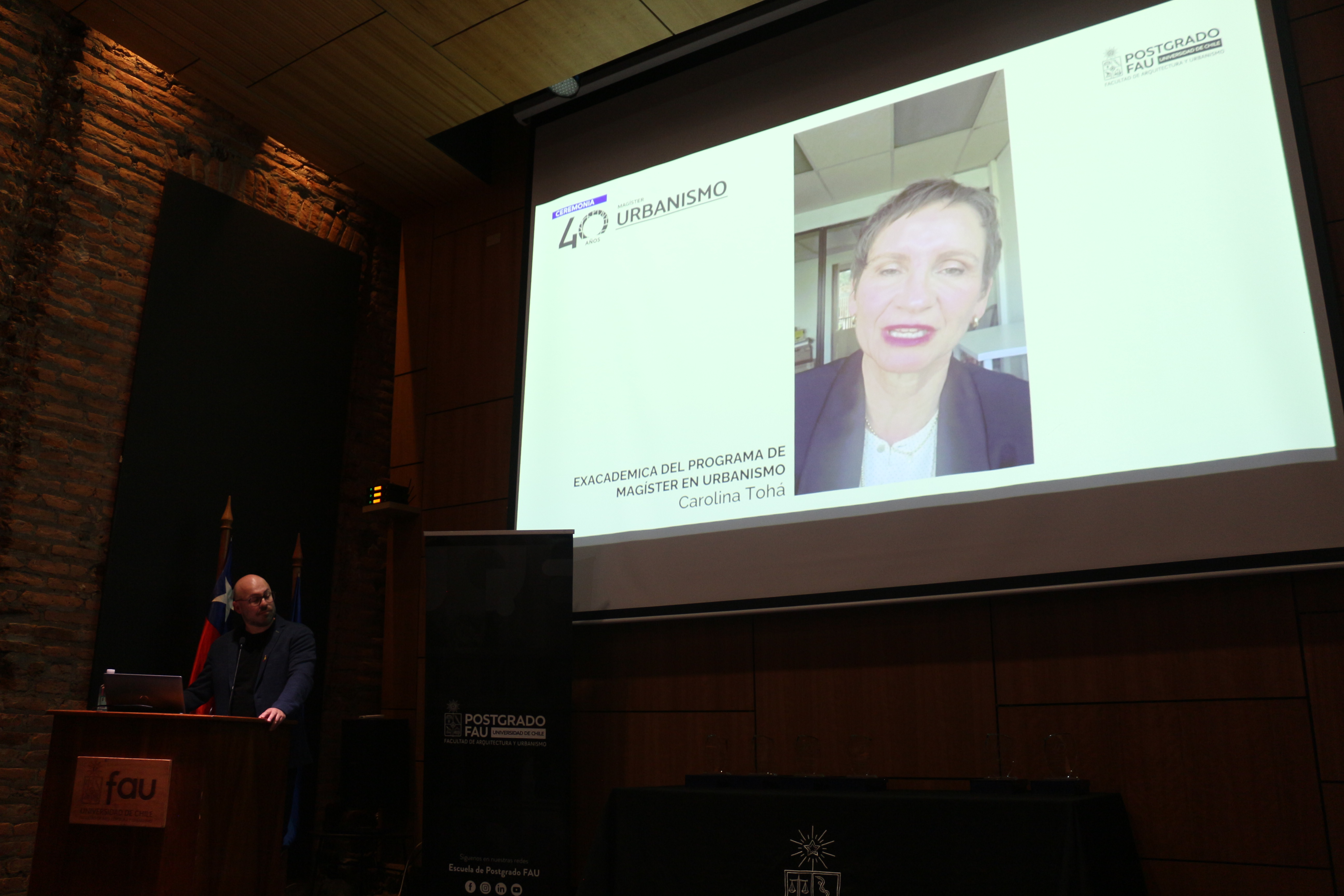 La conmemoración de los 40 años del Magíster en Urbanismo recibió afectuosos saludos institucionales y dio paso a una charla del arquitecto Cristián Castillo, recientemente distinguido con el Premio Nacional de Arquitectura 2024. Entre los mensajes destacó el de la Decana de la Facultad de Arquitectura, Diseño y Estudios Urbanos de la Pontificia Universidad Católica de Chile, Magdalena Vicuña del Río, quien valoró la trayectoria y aporte del programa.