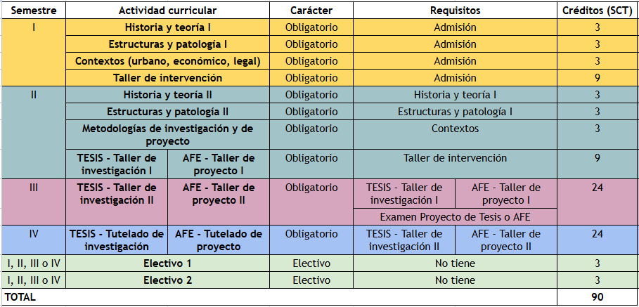 Para la obtención del grado de Magíster en Intervención del Patrimonio Arquitectónico, el (la) estudiante deberá aprobar los Cursos Obligatorios y Electivos indicados en el Plan de Estudios del Programa, equivalentes a 42 créditos. Además, deberá desarrollar y aprobar una Tesis o Actividad Formativa Equivalente a Tesis, correspondiente a 48 créditos.
